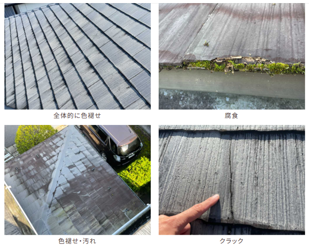 こちらのお客様のご自宅は屋根のカバー工法を致しました。外壁診断では屋根の劣化が多数みられました。写真にある様に、主な劣化状況は全体的に色褪せ、ひび割れ、腐食でした。外壁の状態は良好でしたが、一部リフォーム跡などがありましたので外壁塗装も一緒に施工させて頂きました。